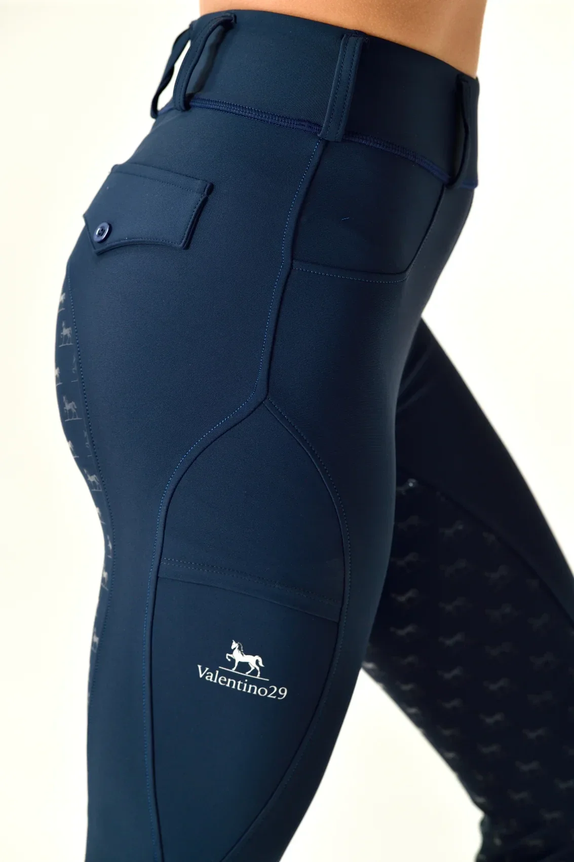 Elevate your equestrian performance with these premium Valentino29 riding leggings. Crafted specifically for riders, these black technical breeches feature an innovative silicone grip pattern that ensures optimal stability in the saddle. The high-waisted design offers excellent core support, while the streamlined fit allows for unrestricted movement during mounting, dismounting, and all riding activities. Strategic pocket placement provides convenient storage without compromising the sleek silhouette. The breathable fabric composition maintains comfort during intense training sessions, while the reinforced knee panels enhance durability. The ankle area features a specialised mesh design for enhanced ventilation and comfort inside boots. These professional-grade leggings transition seamlessly from training to competition, making them an essential addition to any rider's wardrobe. The distinctive Valentino29 branding and horse motif detailing reflect the garment's equestrian heritage. Perfect for year-round use, these breeches maintain their shape and performance through regular riding sessions and washing.